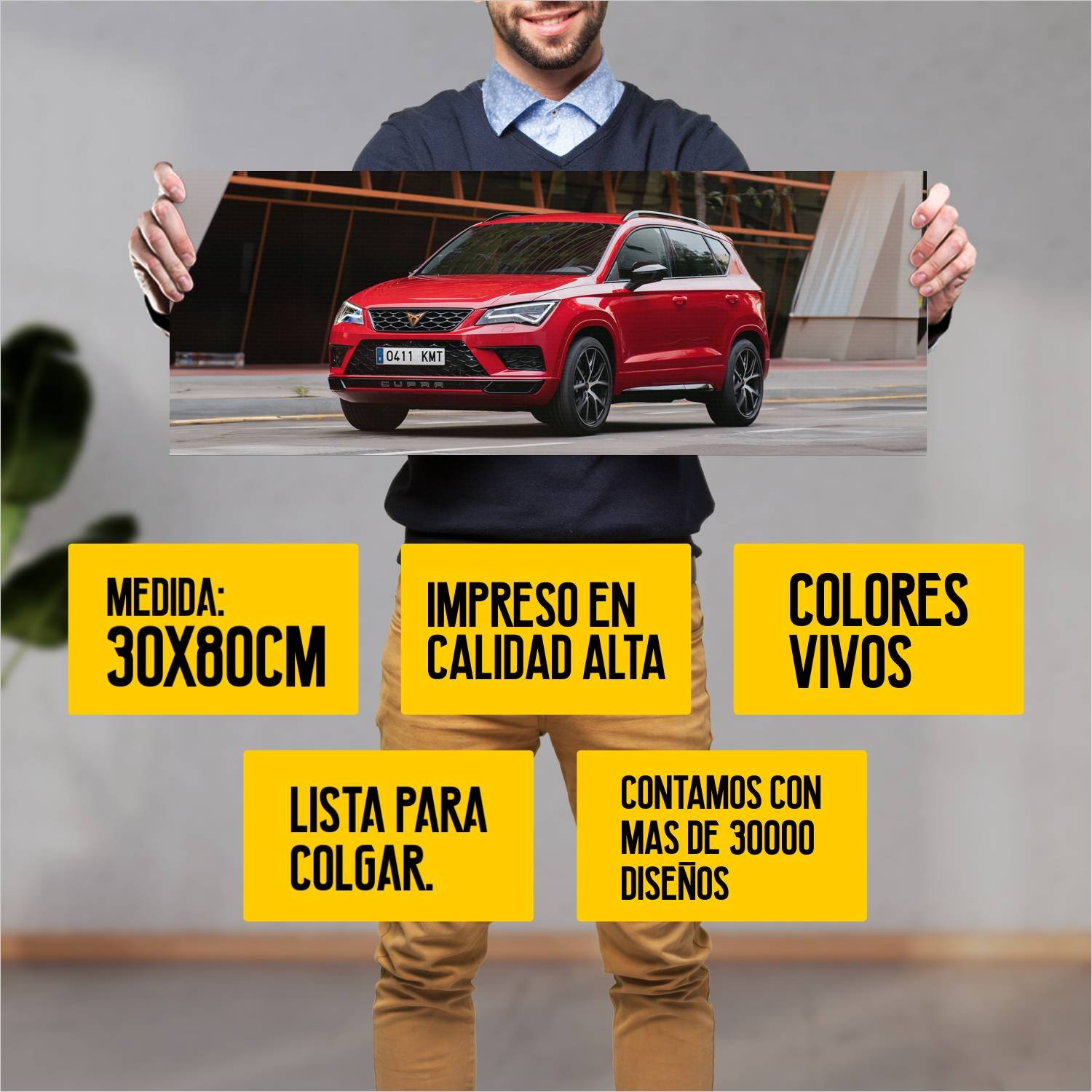 Descubre la elegancia y el estilo con nuestro cuadro impreso en canva full color de 30×80 cm. Este impresionante diseño de 2018 cupra ateca auto 350 es el complemento perfecto para cualquier espacio.