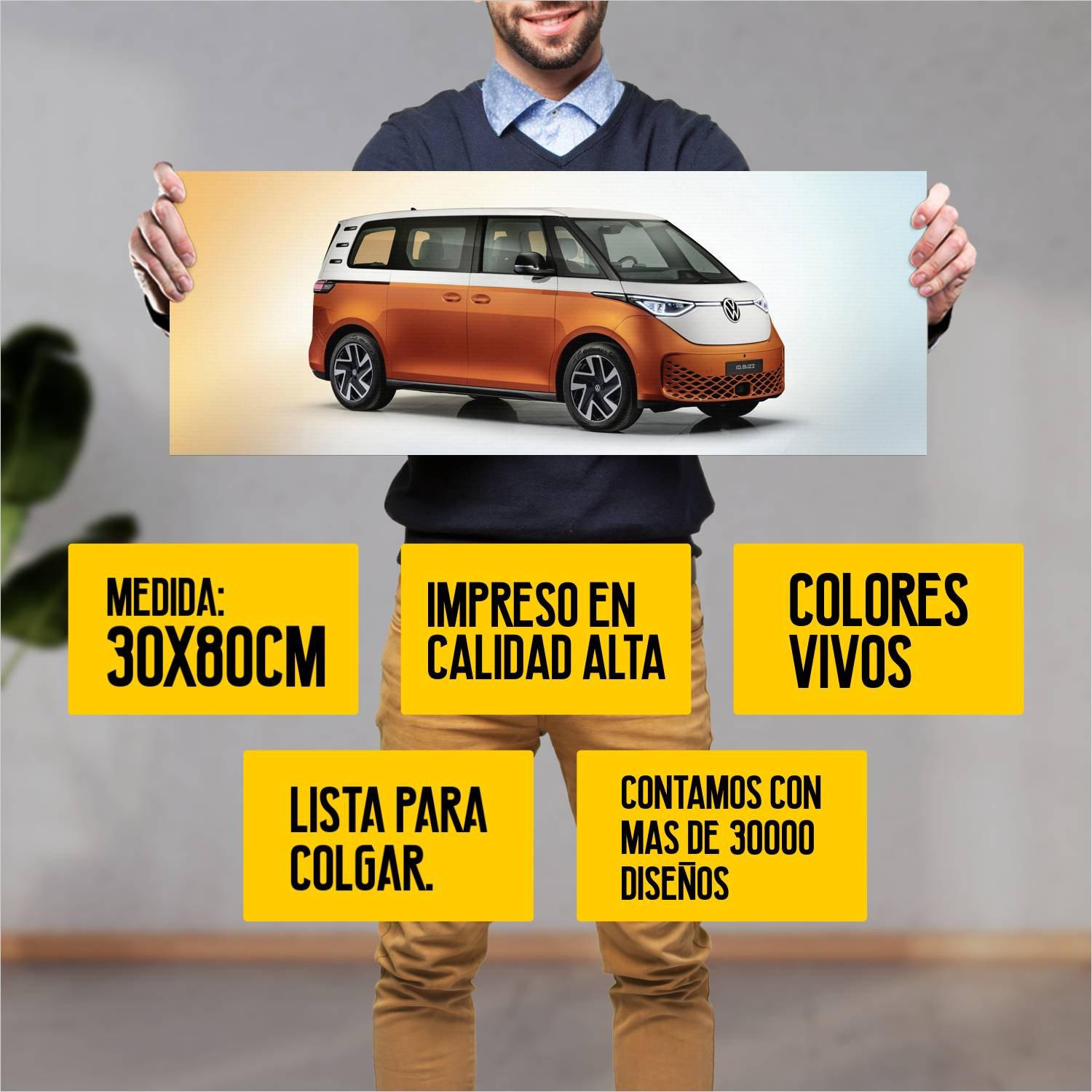 Descubre la elegancia y el estilo con nuestro cuadro impreso en canva full color de 30×80 cm. Este impresionante diseño de 2022 volkswagen id buzz es el complemento perfecto para cualquier espacio.
