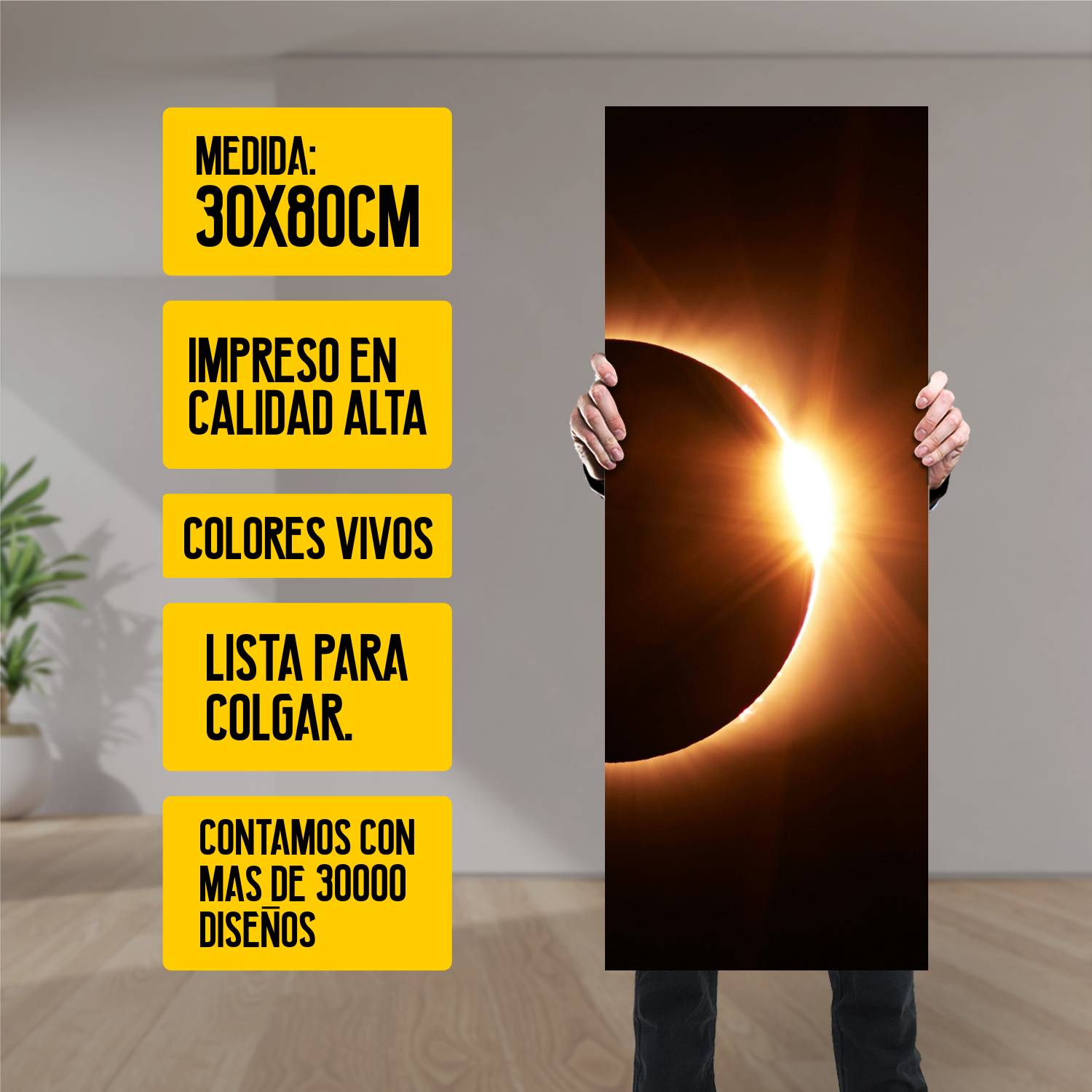 Descubre la elegancia y el estilo con nuestro cuadro impreso en canva full color de 30×80 cm. Este impresionante diseño de Ecilpse solar vertical es el complemento perfecto para cualquier espacio.
