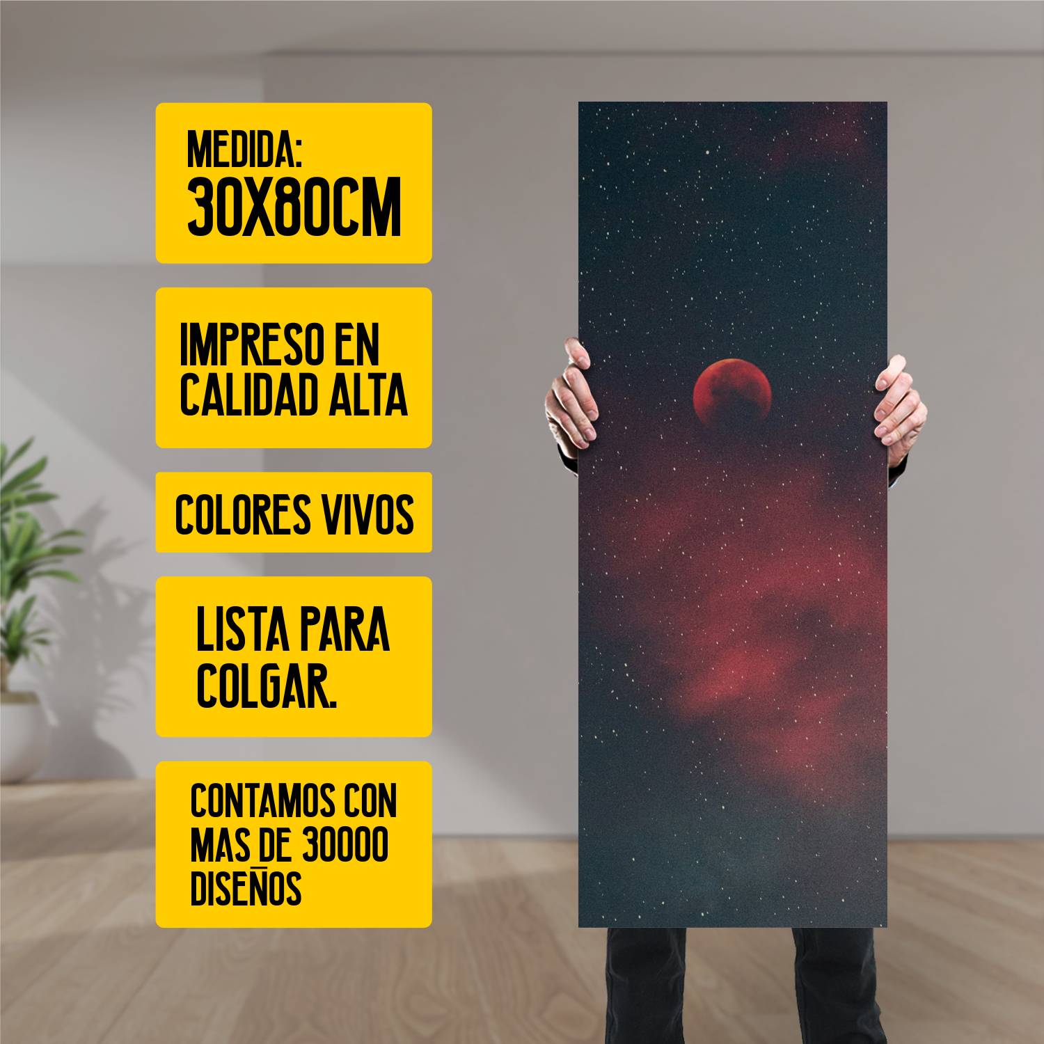 Descubre la elegancia y el estilo con nuestro cuadro impreso en canva full color de 30×80 cm. Este impresionante diseño de Luna naranja estrellada vertical es el complemento perfecto para cualquier espacio.