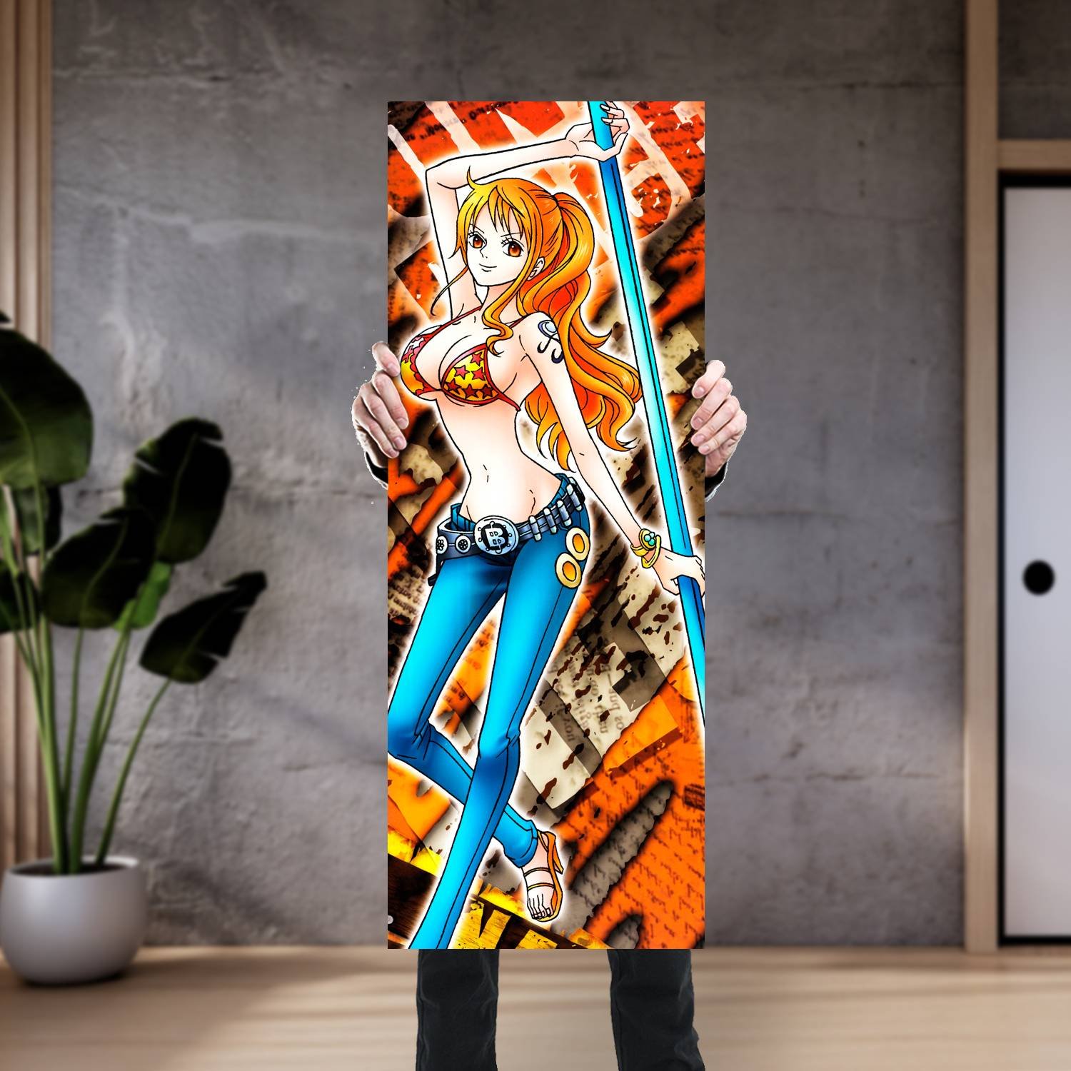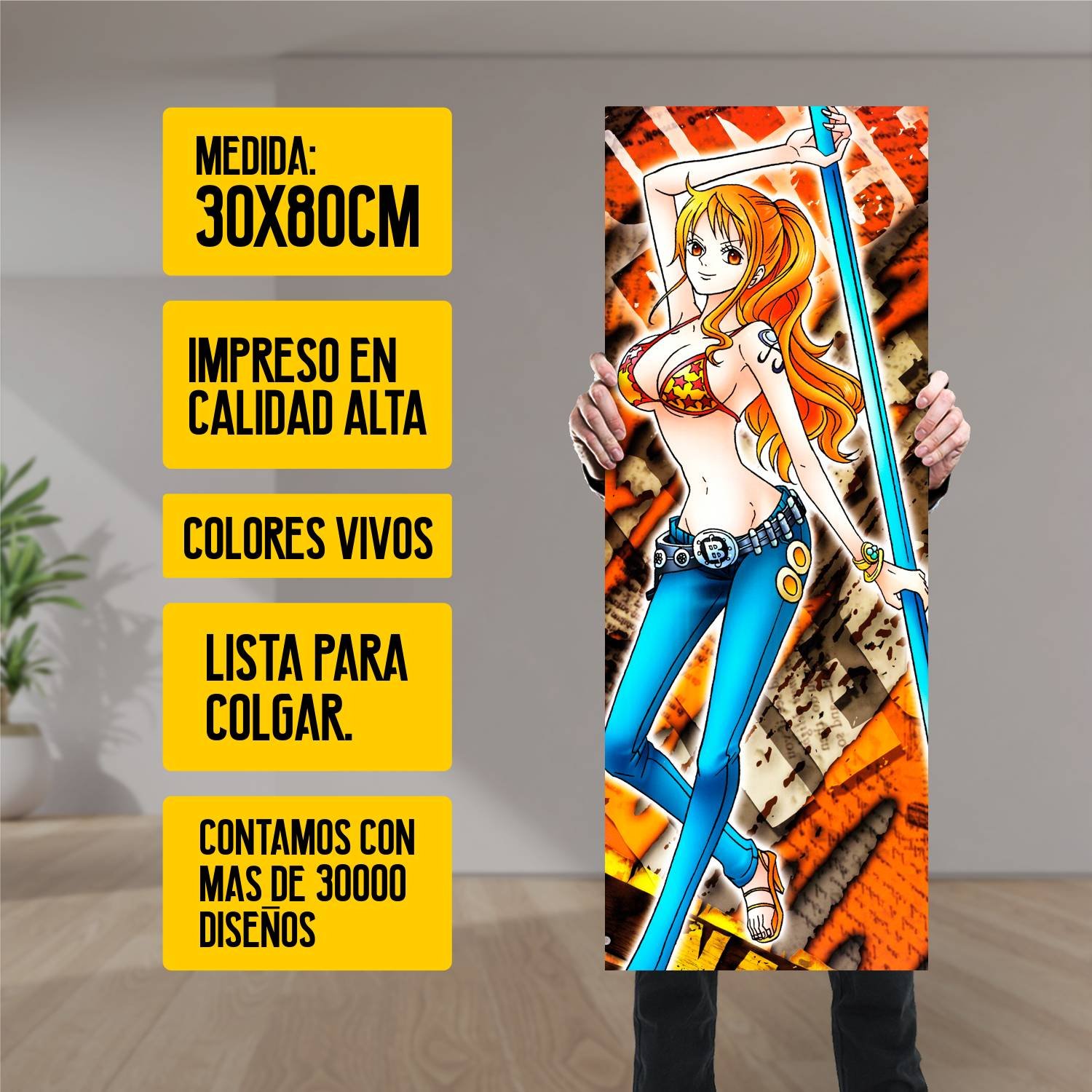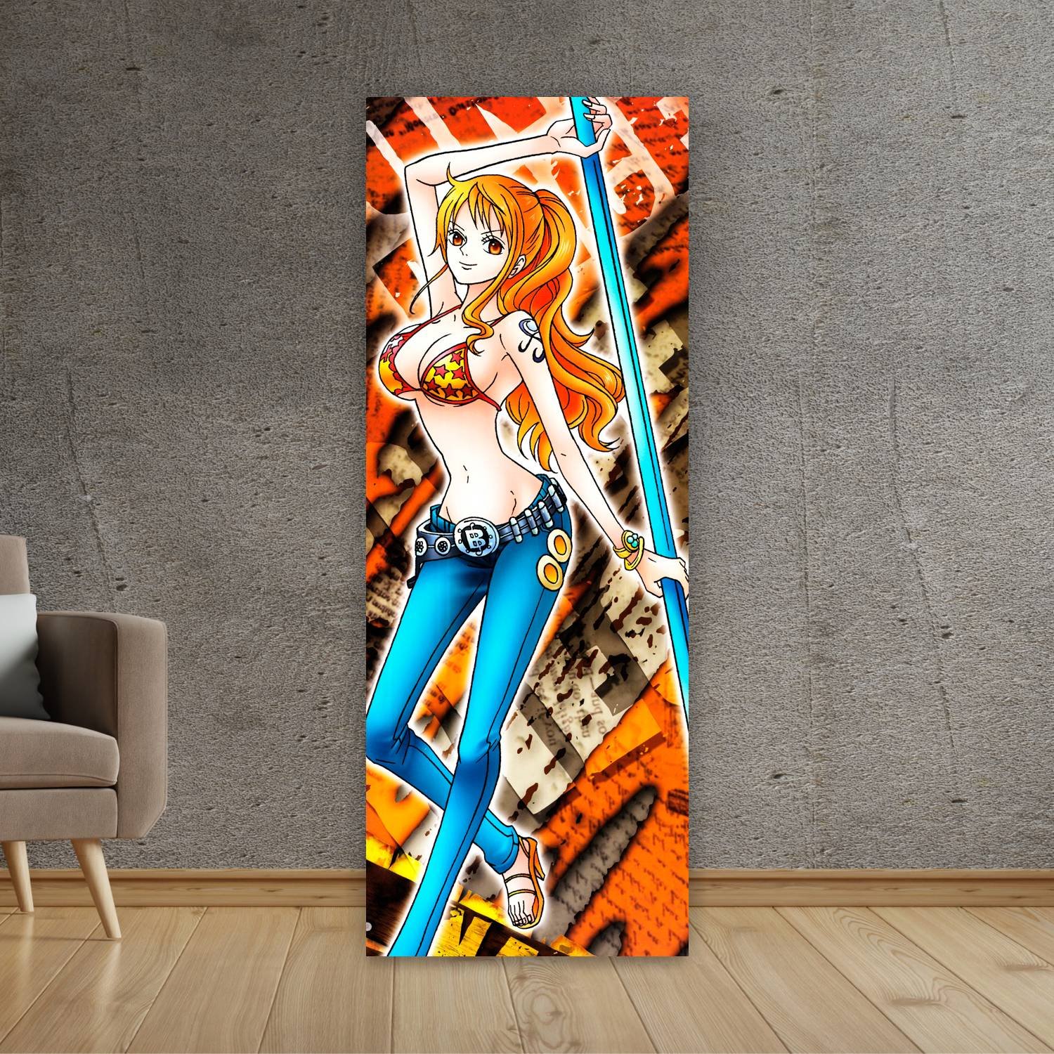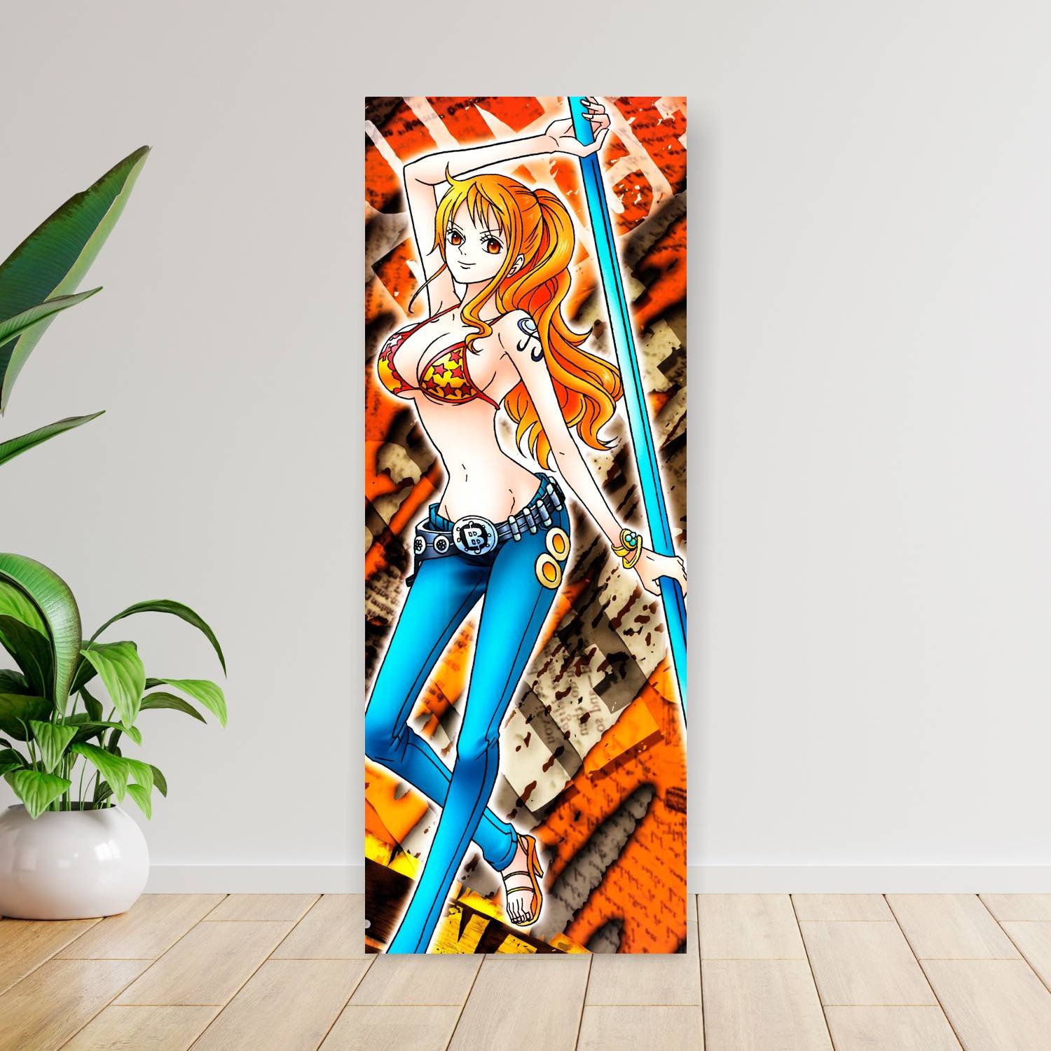 Descubre la elegancia y el estilo con nuestro cuadro impreso en canva full color de 30×80 cm. Este impresionante diseño de Nami pose con baculo es el complemento perfecto para cualquier espacio.
