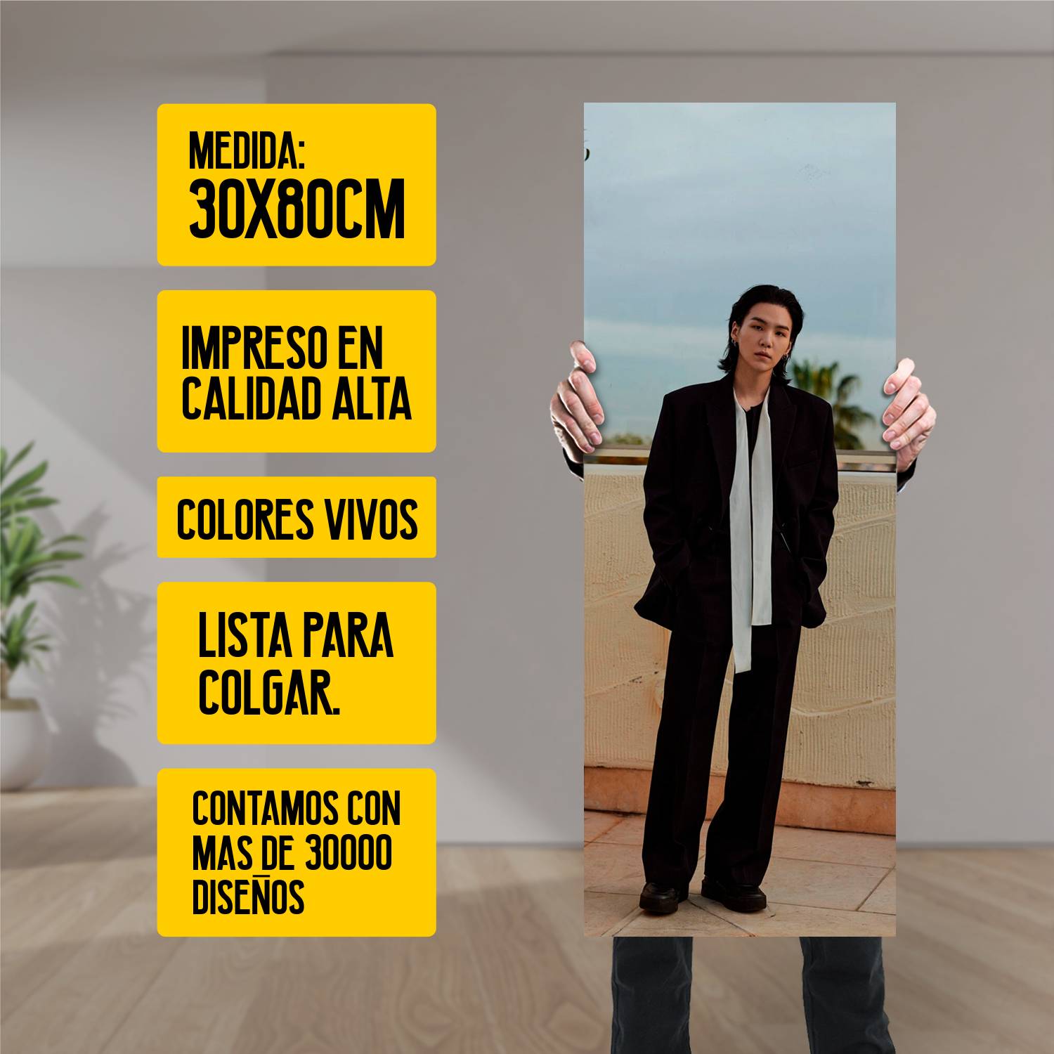 Descubre la elegancia y el estilo con nuestro cuadro impreso en canva full color de 30×80 cm. Este impresionante diseño de Suga BT 095 es el complemento perfecto para cualquier espacio.