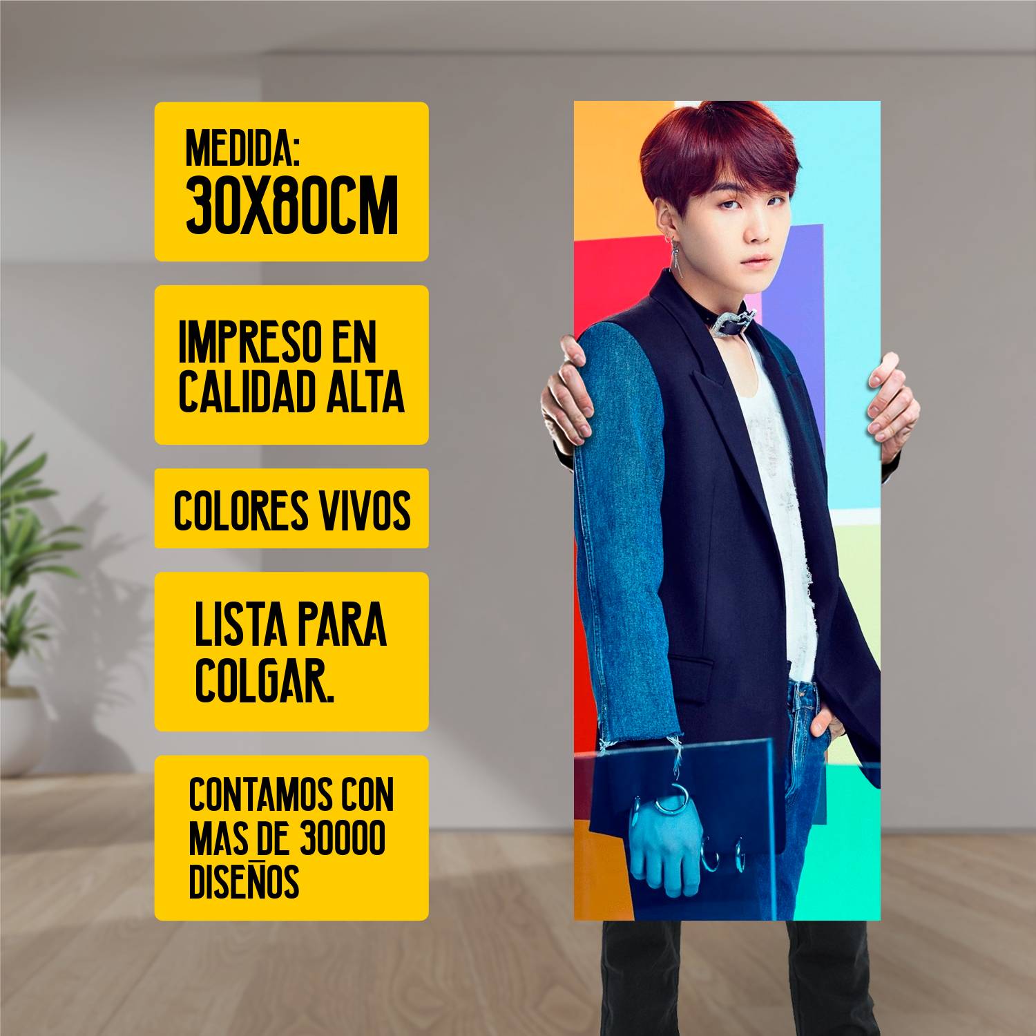 Descubre la elegancia y el estilo con nuestro cuadro impreso en canva full color de 30×80 cm. Este impresionante diseño de Suga BT 101 es el complemento perfecto para cualquier espacio.