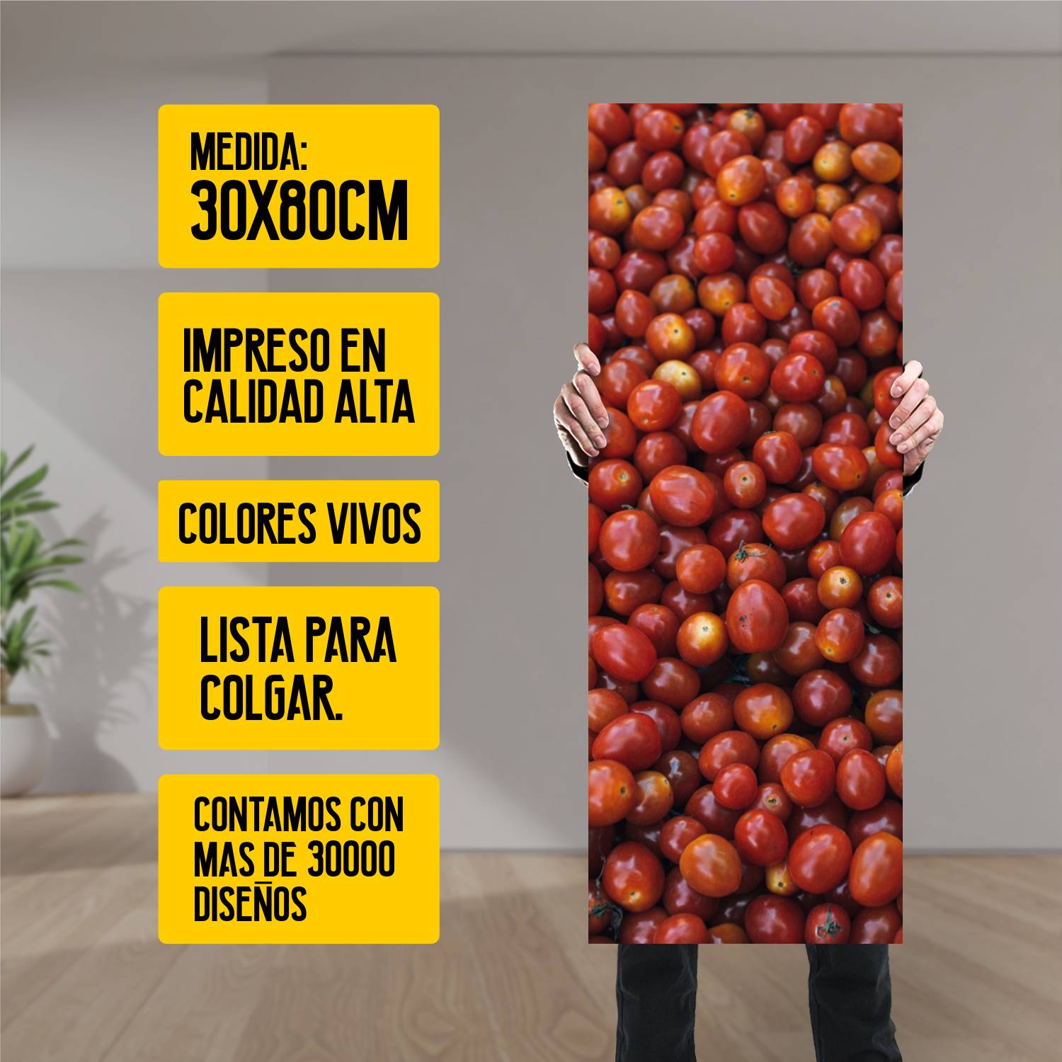 Descubre la elegancia y el estilo con nuestro cuadro impreso en canva full color de 30×80 cm. Este impresionante diseño de tomate fondo es el complemento perfecto para cualquier espacio.